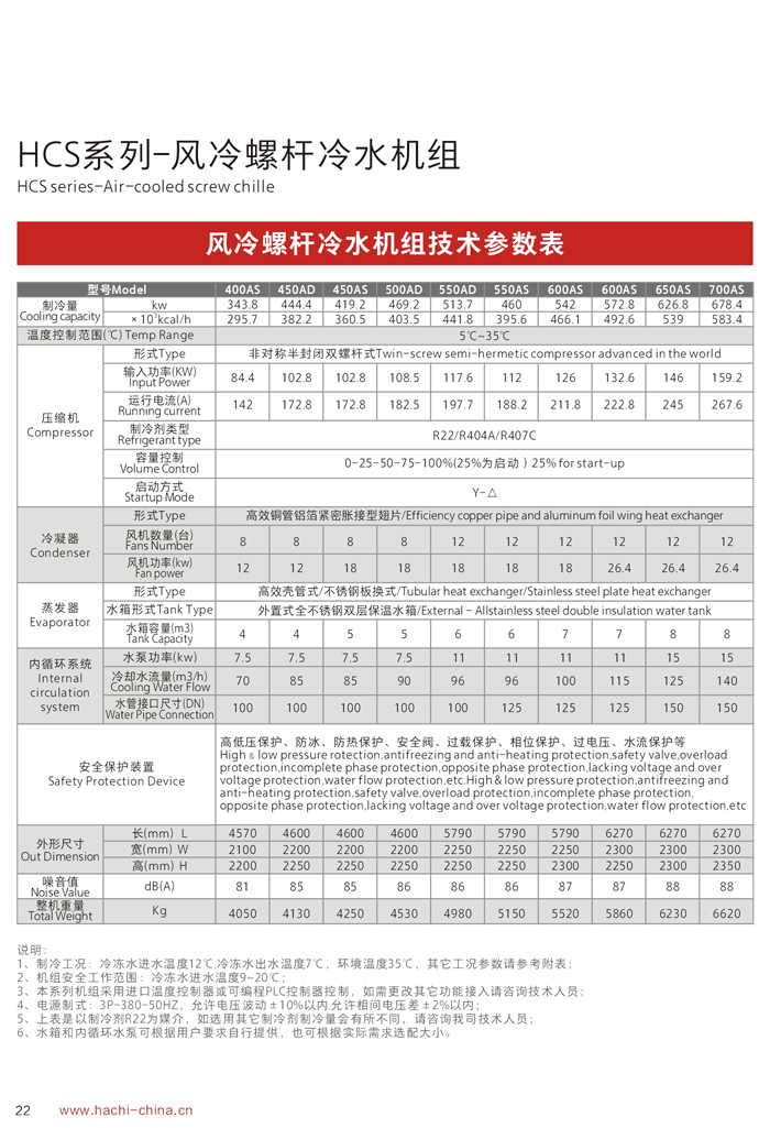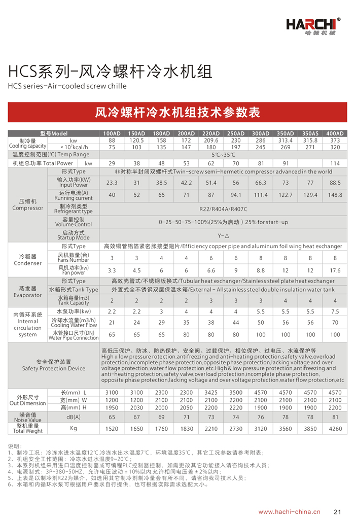 產品特點Features: 1、采用國際最先進的半封閉螺桿壓縮機,電機、壓縮機一體化,無軸封滲漏之慮;電器及制冷系統原器件全部為世界著名品牌; 2、壓縮機容量控制采用多段式或無段式,提供更大范圍的制冷量,載何性能好,穩定性和可靠性更高,更加節省能源,壓縮機采用卸載降壓啟動,避免對電網的沖擊; 3、機組可根據負荷的需求,實行智能化程序控制:100%、75%、50%、25%(或啟動)、0,通過四段空調式連續卸載容量控制系統,更節省能耗; 4、采用德國“SIEMENS”PLC可編程觸摸控制器,人機界面全中文顯示,動畫顯示機組系統各部運轉狀態,可進行參數設定、能量模擬控制、故障查詢等多重保護功能,保證機組安全穩定運行; 5、風冷冷凝器全部采用進口風機及大風量低噪音軸流設計,換熱效率更高;風冷系統無需配置冷卻水塔及冷卻水泵,安裝簡單,移動方便,適合生產場地比較緊缺的環境使用; 6、水冷系列需要配置冷卻水塔及冷卻水泵,冷水機放置在室內,噪音比較低,制冷效果更好,應用于通風散熱不是很好的環境; 7、為保證使用安全,機組內置漏電保護器、相位保護、過載保護、電流保護;系統安裝了高、低壓保護傳感器,為防止缺水或循環水系統內部結冰,機組安裝了流量開關和低液位保護裝置。 8、螺桿冷水機組使用壽命長,穩定性好,無故障運行可達4萬小時以上。