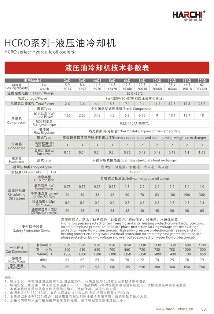 1、制冷能力是在環境溫度35℃,進油溫度35℃,出油溫度30℃,油品為ISO VG32條件下測得。 2、用戶在選擇油冷機時,必須選擇油液需控制的溫度范圍(1)18℃-25℃ (2)25℃-35℃ (3)35℃-45℃